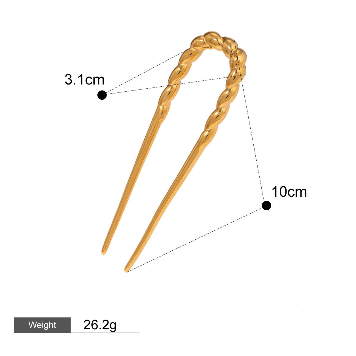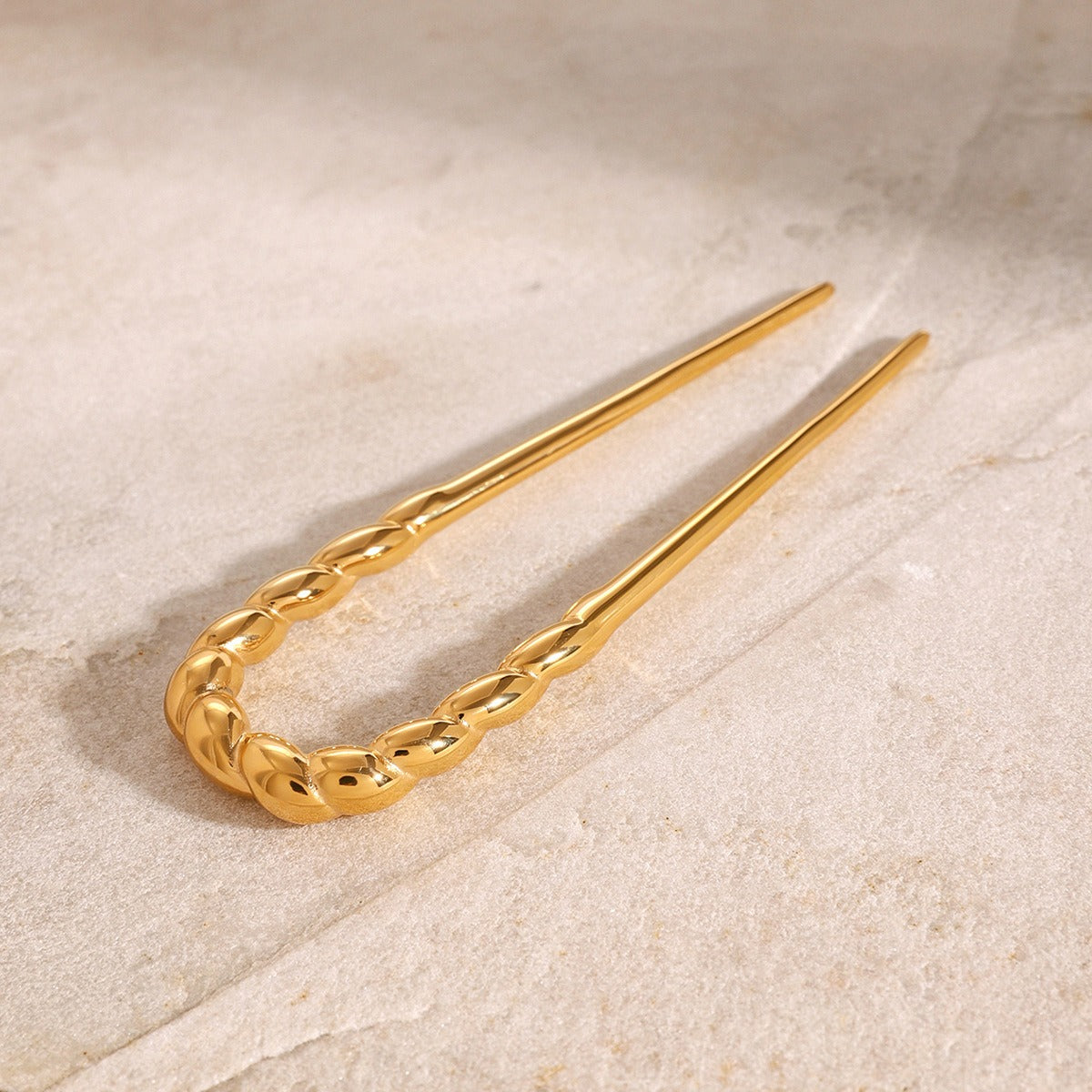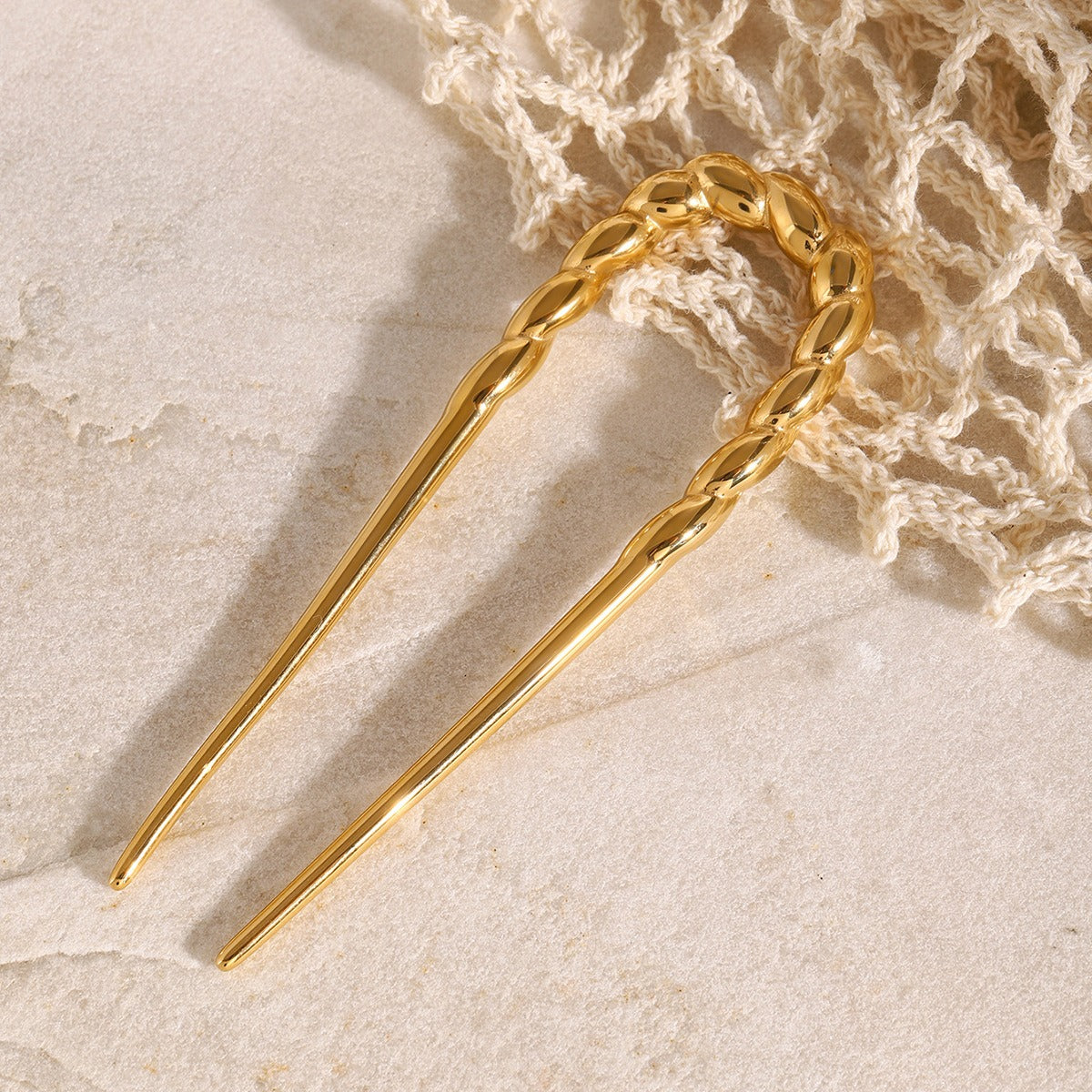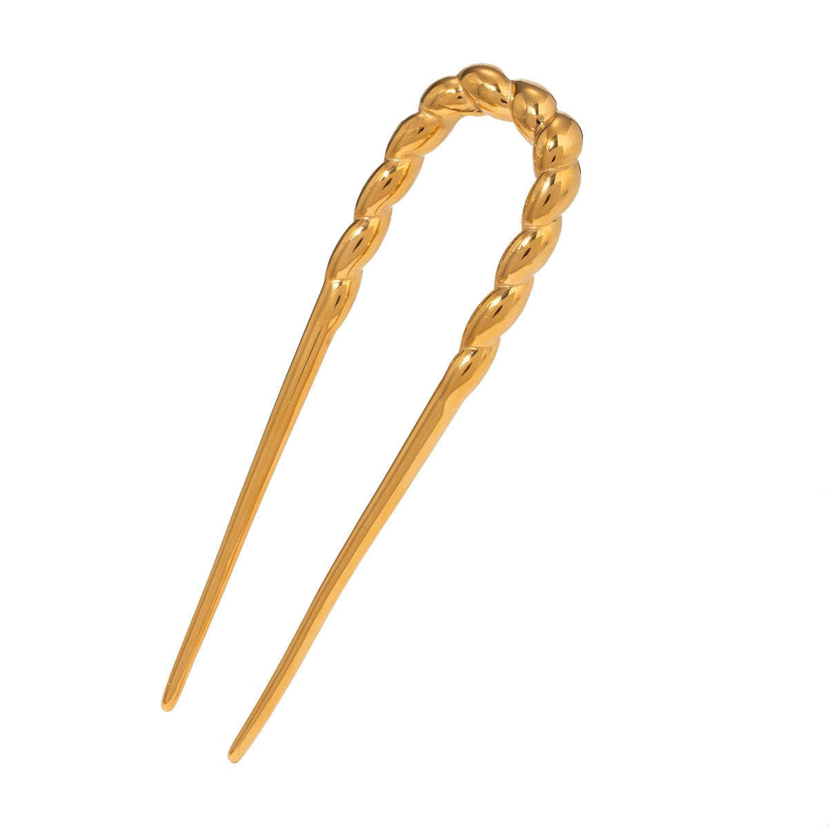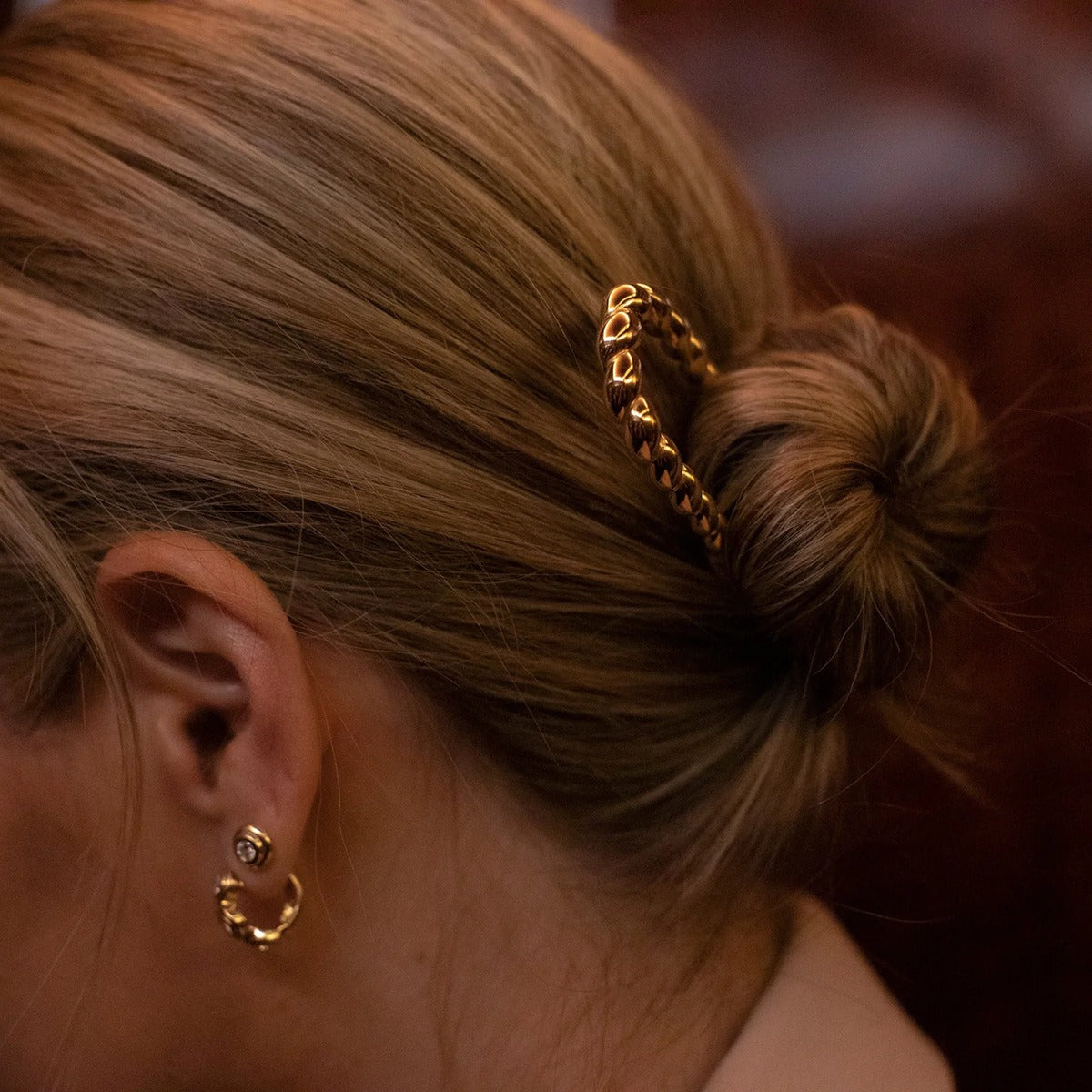 This hair accessory adopts a unique twisted texture design, showing the perfect combination of modern simplicity and exquisite craftsmanship. The elegant 18K gold material and fine texture carving make this hair accessory both low-key luxury and fashionable avant-garde. Its smooth lines and natural curved design allow the wearer to exude unique charm and confidence in any occasion.